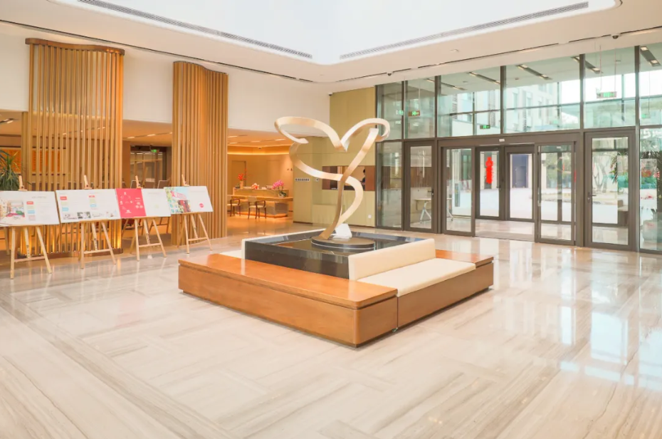区别于传统的养老机构,半壁店恭和家园与城市生活更具亲和关系。机构大堂位于社区的半公共界面——3号楼一层,承载社区医院、养老机构与康养生活馆的服务空间,也为社区生活提供缓冲作用。机构大堂大量运用原木元素,通过艺术装置与自然的结合,可使来宾访客拥有舒适安稳的感官体验。大堂内设有兼具开放与私密性的会客区,满足长辈家人休憩、会客、邻里社交等多重需求;并融入生活管家服务台,为长辈提供日常便民服务。每栋养老公寓皆会设置公寓大堂,大堂空间运用大面积的干净、柔和色彩,结合原木、石材,营造优雅、舒适、温馨的氛围。半壁店恭和家园从长辈需求出发,将“会客厅”理念深植空间营造之中,在长辈高频使用的公寓出入口,构筑起家门口的交流新空间,成为承载邻里社交、家庭社交的私享空间。